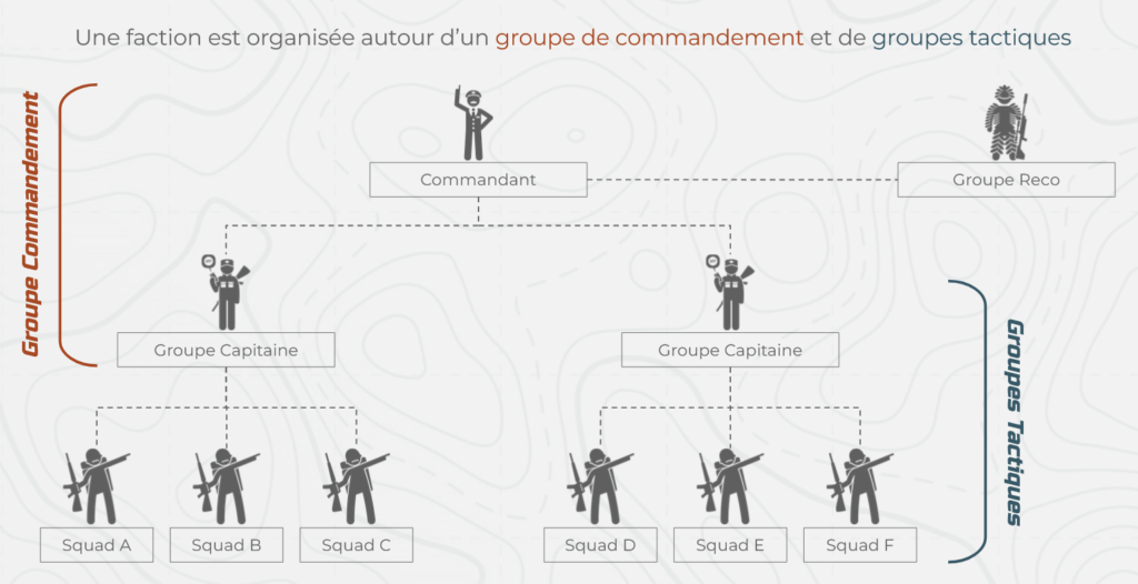 Un groupe tactique est organisé autour d’un capitaine pour coordonner les squads et simplifier les communications.